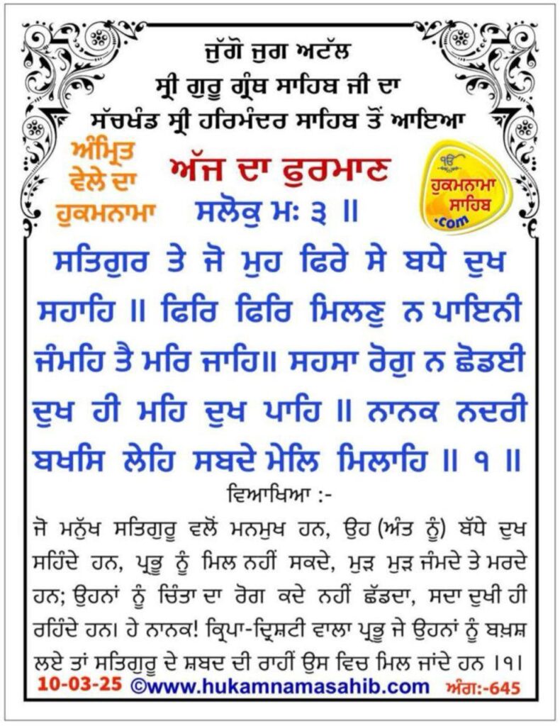 Those who turn their faces away from the True Guru, suffer in sorrow and bondage. Again and again, they are born only to die; they cannot meet their Lord. The disease of doubt does not depart, and they find only pain and more pain. O Nanak, if the Gracious Lord forgives, then one is united in Union with the Word of the Shabad. || 1 || THIRD MEHL: Those who turn their faces away from the True Guru, shall find no place of rest or shelter. They wander around from door to door, like a woman forsaken, with a bad character and a bad reputation. O Nanak, the Gurmukhs are forgiven, and united in Union with the True Guru.ਉ ॥ ਜਿਉ ਛPAUREE: Those who serve the True Lord, the Destroyer of ego, cross over the terrifying world-ocean. Those who chant the Name of the Lord, Har, Har, are passed over by the Messenger of Death. Those who meditate on the Lord, go to His Court in robes of honor. They alone serve You, O Lord, whom You bless with Grace. I sing continually Your Glorious Praises, O Beloved; as Gurmukh, my doubts and fears have been dispelled. ਬੋਲਹਿ ਹਰMonday, 27th Phalgun (Samvat 556 Nanakshahi)