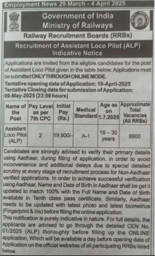ਸਰਕਾਰੀ ਅਸਾਮੀਆਂ ਨਿਕਲਣ ਦੀ ਉਡੀਕ ਕਰ ਰਹੇ ਨੌਜਵਾਨਾਂ ਲਈ ਇਹ ਚੰਗੀ ਖਬਰ ਹੈ ਕਿ ਆਰਆਰਬੀ ਵੱਲੋਂ ਵੱਡੀ ਗਿਣਤੀ ਅਸਾਮੀਆਂ ਕੱਢੀਆਂ ਗਈਆਂ ਹਨ। Railway Recruitment Board (RRB) ਵੱਲੋਂ ਵੱਖ ਵੱਖ ਜੋਨਲਾਂ ਲਈ ਅਸਾਮੀਆਂ ਕੱਢੀਆਂ ਗਈਆਂ ਹਨ। ਇਨ੍ਹਾਂ ਅਸਾਮੀਆਂ ਲਈ ਯੋਗ ਉਮੀਦਵਾਰ 10 ਅਪ੍ਰੈਲ 2025 ਤੋਂ 9 ਮਈ 2025 ਤੱਕ ਆਨਲਾਈਨ ਅਪਲਾਈ ਕਰ ਸਕਦੇ ਹਨ।