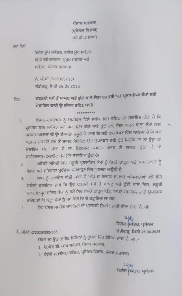 ਪੰਜਾਬ ਸਰਕਾਰ ਵੱਲੋਂ ਮੋਬਾਇਲਾਂ ਸਬੰਧੀ ਅਧਿਕਾਰੀਆਂ ਨੂੰ ਹੁਕਮ ਜਾਰੀ ਕੀਤੇ ਹਨ। ਸਰਕਾਰ ਨੇ ਹੁਕਮਾਂ ਵਿੱਚ ਕਿਹਾ ਕਿ ਕੁਝ ਅਫ਼ਤਸਰ ਦਫ਼ਤਰੀ ਸਮੇਂ ਤੋਂ ਬਾਅਦ ਮੋਬਾਇਲ ਉਤੇ ਉਪਲੱਬਧ ਨਹੀਂ ਹੁੰਦੇ, ਕਿਉਂਕਿ ਜਾਂ ਤਾਂ ਉਨ੍ਹਾਂ ਦਾ ਮੋਬਾਇਲ ਬੰਦ ਹੁੰਦਾ ਹੈ ਜਾਂ ਨੈਟਵਰਕ ਕਵਰੇਜ ਖੇਤਰ ਤੋਂ ਬਾਹਰ ਹੁੰਦਾ ਹੈ ਜਾਂ ਡਾਈਵਰਜਨ/ਫਲਾਈਟ ਮੋਡ ਉਤੇ ਲਗਾਇਆ ਹੁੰਦਾ ਹੈ।