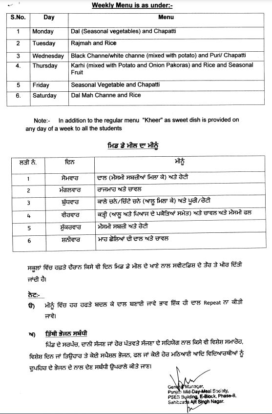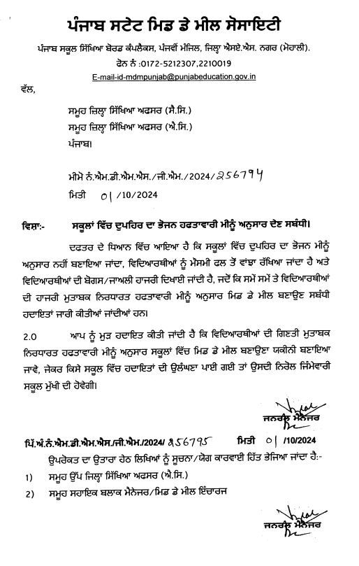 ਸਕੂਲ ਵਿੱਚ ਵਿਦਿਆਰਥੀਆਂ ਨੂੰ ਦਿੱਤੇ ਜਾ ਰਹੇ ਮਿਡ ਡੇ ਮੀਲ ਨੂੰ ਲੈ ਕੇ ਸਿੱਖਿਆ ਵਿਭਾਗ ਵੱਲੋਂ ਇਕ ਪੱਤਰ ਜਾਰੀ ਕੀਤਾ ਗਿਆ ਹੈ। ਇਸ ਪੱਤਰ ਵਿੱਚ ਕਿਹਾ ਗਿਆ ਹੈ ਕਿ ਸਕੂਲਾਂ ਵਿੱਚ ਮਿਡ ਡੇ ਮੀਲ ਨਿਧਾਰਤ ਮੀਨੂੰ ਮੁਤਾਬਕ ਨਹੀਂ ਦਿੱਤਾ ਜਾ ਰਿਹਾ। ਵਿਭਾਗ ਨੇ ਕਿਹਾ ਕਿ ਦੁਪਹਿਰ ਦਾ ਭੋਜਨ ਮੀਨੂੰ ਅਨੁਸਾਰ ਨਹੀਂ ਬਣਾਇਆ ਜਾਂਦਾ, ਵਿਦਿਆਰਥੀਆਂ ਨੂੰ ਮੌਸਮੀ ਫਲ ਤੋਂ ਵਾਂਝਾ ਰੱਖਿਆ ਜਾਂਦਾ ਹੈ ਅਤੇ ਵਿਦਿਆਰਥੀਆਂ ਦੀ ਹਾਜ਼ਰੀ ਜਾਅਲੀ ਦਿਖਾਈ ਜਾਂਦੀ ਹੈ। ਪੱਤਰ ਵਿੱਚ ਇਹ ਵੀ ਕਿਹਾ ਗਿਆ ਹੈ ਕਿ ਜੇਕਰ ਸਕੂਲ ਵਿੱਚ ਉਲੰਘਣਾ ਪਾਈ ਗਈ ਤਾਂ ਉਸਦੀ ਨਿਰੋਲ ਜ਼ਿੰਮੇਵਾਰੀ ਸਕੂਲ ਮੁੱਖੀ ਦੀ ਹੋਵੇਗੀ।