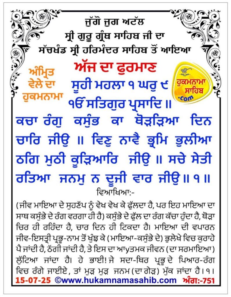 ਅੰਮ੍ਰਿਤ ਵੇਲੇ ਦਾ ਹੁਕਮਨਾਮਾ ਸ੍ਰੀ ਦਰਬਾਰ ਸਾਹਿਬ ਅੰਮ੍ਰਿਤਸਰ