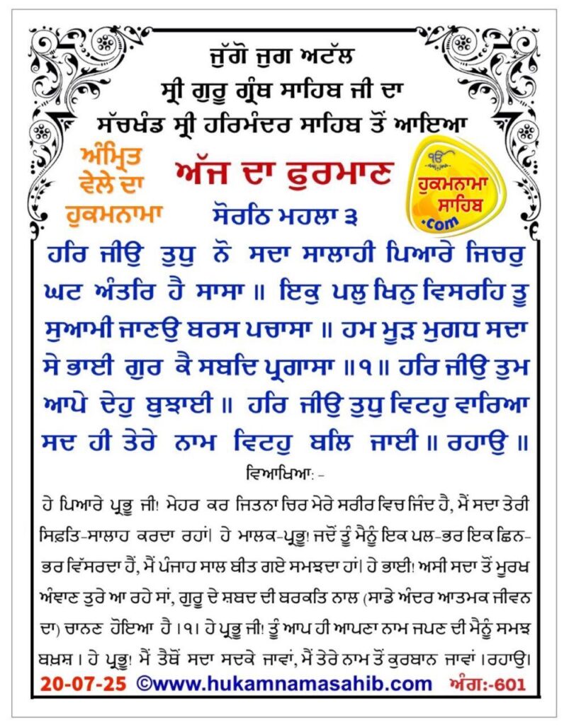 ਸੱਚਖੰਡ ਸ੍ਰੀ ਹਰਿਮੰਦਰ ਸਾਹਿਬ, ਸ੍ਰੀ ਅੰਮ੍ਰਿਤਸਰ, 20-07-2025