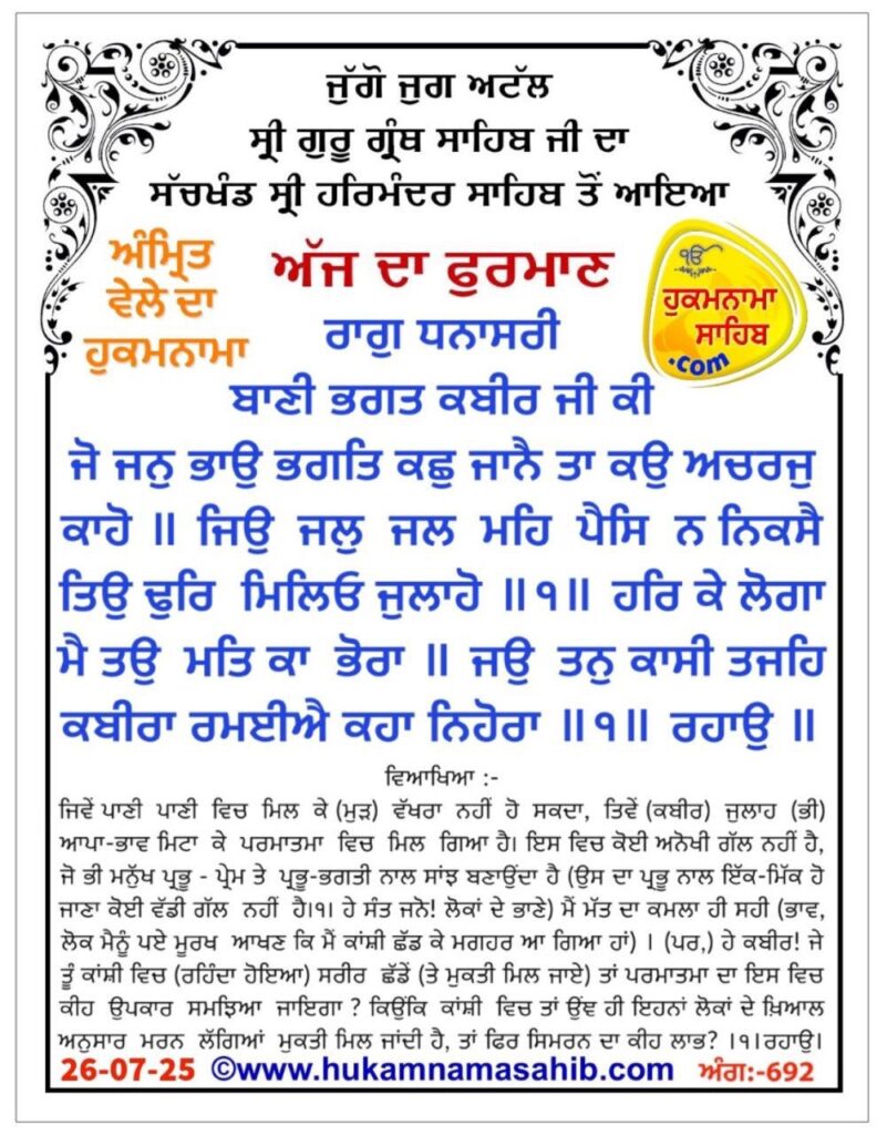 ਸੱਚਖੰਡ ਸ੍ਰੀ ਹਰਿਮੰਦਰ ਸਾਹਿਬ, ਸ੍ਰੀ ਅੰਮ੍ਰਿਤਸਰ, 26-07-2025
