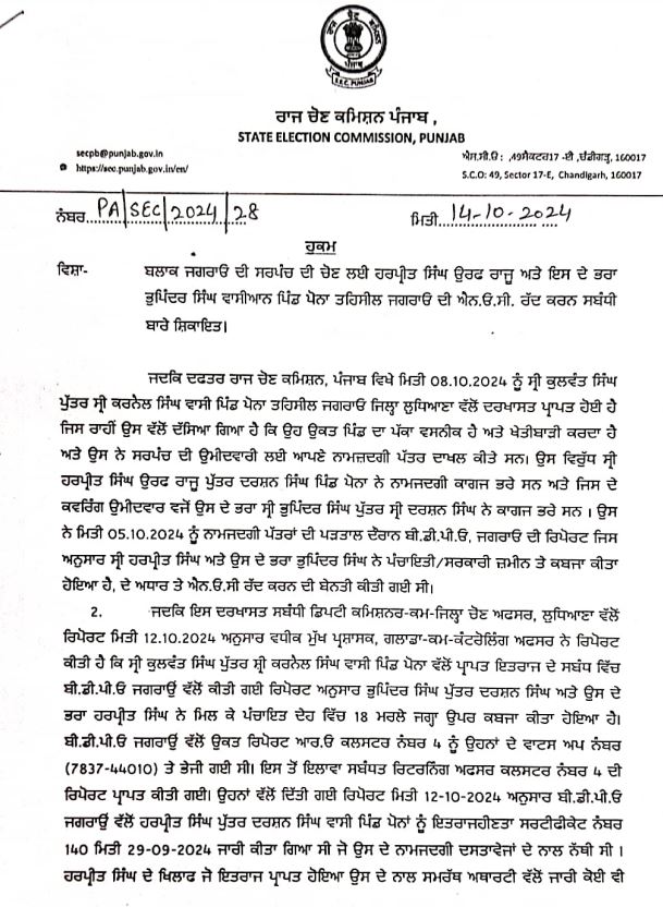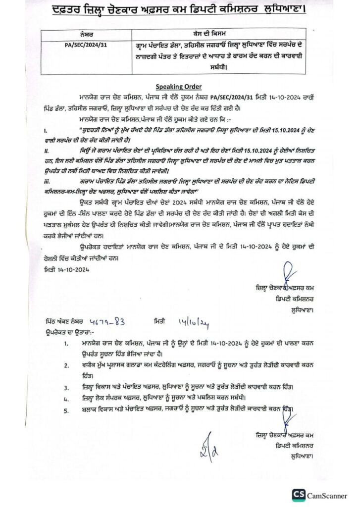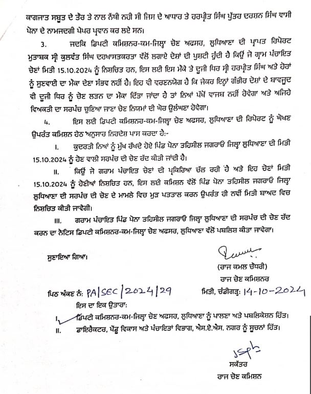 ਲੁਧਿਆਣਾ ਜ਼ਿਲ੍ਹੇ ਦੇ ਦੋ ਸਰਪੰਚਾਂ ਲਈ ਹੋਣ ਵਾਲੀ ਚੋਣ ਰੱਦ ਕੀਤੀ ਗਈ ਹੈ। ਚੋਣ ਰੱਦ ਕਰਨ ਦਾ ਫੈਸਲਾ ਵੋਟਾਂ ਪੈਣ ਦੇ ਸ਼ੁਰੂ ਹੋਣ ਤੋਂ ਕੁਝ ਸਮਾਂ ਪਹਿਲਾਂ ਹੀ ਕੀਤਾ ਗਿਆ ਹੈ। ਇਹ ਫੈਸਲਾ ਇਸ ਲਈ ਕੀਤਾ ਕਿ ਕਿ ਐਨਓਸੀ ਨੂੰ ਲੈ ਕੇ ਚੋਣ ਕਮਿਸ਼ਨ ਨੂੰ ਸ਼ਿਕਾਇਤਾਂ ਮਿਲੀਆਂ ਸਨ। ਜਿਸ ਤੋਂ ਬਾਅਦ ਇਹ ਫੈਸਲਾ ਕੀਤਾ ਗਿਆ। ਪਿੰਡ ਡੱਲਾ ਅਤੇ ਪੋਨਾ ਦੀ ਹੋਣ ਵਾਲੀ ਸਰਪੰਚ ਦੀ ਚੋਣ ਰੱਦ ਕੀਤੀ ਗਈ ਹੈ।