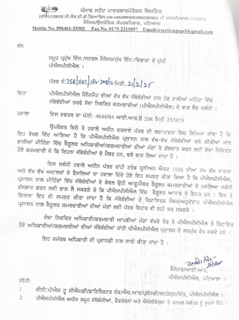 208 /12 ਮਿਤੀ 21-2-2025 ਸਮੂਹ ਪ੍ਰਮੁੱਖ ਇੰਜੀਨੀਅਰਾਂ, ਵਿਭਾਗ ਦੇ ਮੁਖੀ ਨੂੰ ਨੋਟੀਫਕੇਸ਼ਨ ਜਾਰੀ ਕਰਕੇ ਸੇਵਾ ਮੁਕਤ ਕਰਮਚਾਰੀਆਂ ਦੀਆਂ ਮੀਟਿੰਗਾਂ ਵਿੱਚ ਸ਼ਮੂਲੀਆਂ ਤੇ ਰੋਕ ਲਗਾਈ ਗਈ ਹੈ। ਇਸ ਪੱਤਰ ਵਿੱਚ ਟੇਡ ਯੂਨੀਅਨ ਐਕਟ 1926 ਦੀਆਂ ਵੱਖ-ਵੱਖ ਧਰਾਵਾਂ ,ਅਦਾਲਤੀ ਫੈਸਲੇਆ ਦਾ ਜ਼ਿਕਰ ਕੀਤਾ ਗਿਆ ਹੈ। ਇਸ ਪੱਤਰ ਵਿੱਚ ਸਪੱਸ਼ਟ ਕੀਤਾ ਕਿ ਜੇਕਰ ਸੇਵਾ ਮੁਕਤ ਹੋਏ ਮੁਲਾਜ਼ਮ ਮੀਟਿੰਗਾਂ ਵਿੱਚ ਆਉਂਦੇ ਹਨ ਤਾਂ ਇਸ ਸਬੰਧੀ ਪ੍ਰਸ਼ਾਸਨ ਦੇ ਧਿਆਨ ਚ ਲਿਆ ਕੇ ਕਾਨੂੰਨ ਅਨੁਸਾਰ ਕਾਰਵਾਈ ਜਾਵੇ।