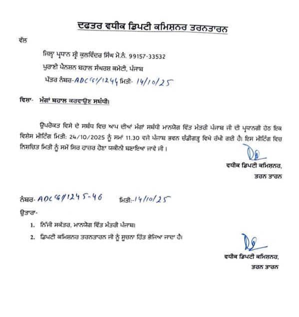 ਪੁਰਾਣੀ ਪੈਨਸ਼ਨ ਬਹਾਲੀ ਦੀ ਮੰਗ ਕਰ ਰਹੇ ਹਨ। ਪੁਰਾਣੀ ਪੈਨਸ਼ਨ ਬਹਾਲੀ ਸੰਘਰਸ਼ ਕਮੇਟੀ ਦੀ ਵਿੱਤ ਮੰਤਰੀ ਹਰਪਾਲ ਸਿੰਘ ਚੀਮਾ ਨਾਲ ਮੀਟਿੰਗ ਤੈਅ ਹੋਈ ਹੈ। ਪੁਰਾਣੀ ਪੈਨਸ਼ਨ ਬਹਾਲੀ ਸੰਘਰਸ਼ ਕਮੇਟੀ ਪੰਜਾਬ ਜ਼ਿਲ੍ਹਾ ਤਰਨਤਾਰਨ ਵਲੋਂ ਪੰਜਾਬ ਦੇ ਮੁੱਖ ਮੰਤਰੀ ਭਗਵੰਤ ਮਾਨ ਦੇ ਘਿਰਾਓ ਐਕਸ਼ਨ ਦਾ ਸੱਦਾ ਦਿੱਤਾ ਗਿਆ ਸੀ। ਇਸ ਤੋਂ ਪਹਿਲਾਂ ਹੀ ਜ਼ਿਲ੍ਹਾ ਮੁਕਤਸਰ ਵੱਲੋਂ ਵਿੱਤ ਮੰਤਰੀ ਨਾਲ ਮੀਟਿੰਗ ਤੈਅ ਕਰਵਾਈ ਗਈ ਹੈ। ਮੀਟਿੰਗ 24 ਅਕਤੂਬਰ 2025 ਨੂੰ ਪੰਜਾਬ ਭਵਨ ਚੰਡੀਗੜ੍ਹ ਵਿਖੇ ਹੋਵੇਗੀ।