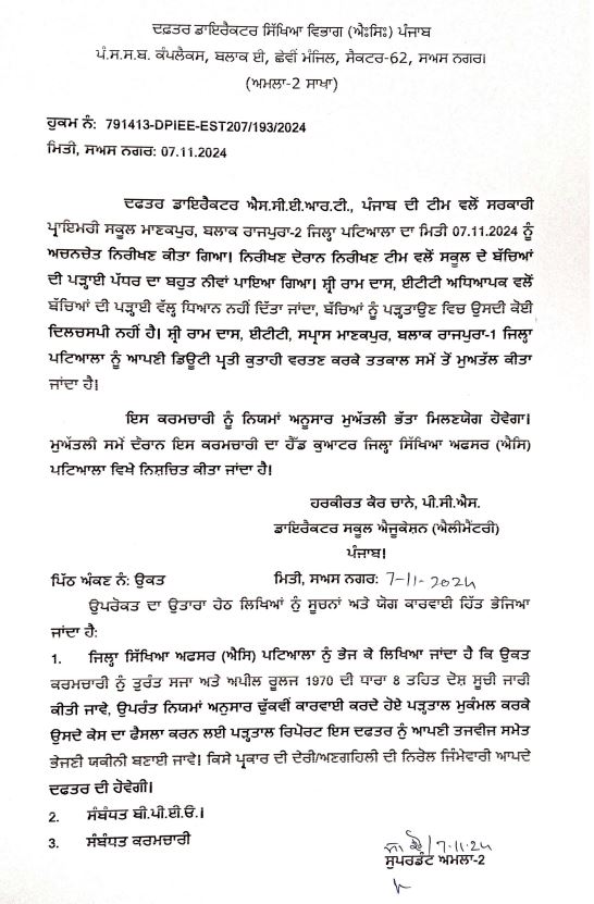 ਐਸ ਸੀ ਈ ਆਰ ਟੀ ਪੰਜਾਬ ਦੀ ਟੀਮ ਵੱਲੋਂ ਸਰਕਾਰੀ ਪ੍ਰਾਇਮਰੀ ਸਕੂਲ ਮਾਣਕਪੁਰ ਜ਼ਿਲ੍ਹਾ ਪਟਿਆਲਾ ਦਾ ਅਚਨਚੇਤ ਨਿਰੀਖਣ ਕੀਤਾ ਗਿਆ। ਨਿਰੀਖਣ ਦੌਰਾਨ ਸਕੂਲ ਦੇ ਬੱਚਿਆਂ ਦੀ ਪੜ੍ਹਾਈ ਦਾ ਪੱਧਰ ਬਹੁਤ ਨੀਵਾਂ ਹੋਣ ਕਾਰਨ ਸਰਕਾਰੀ ਸਕੂਲ ਦੇ ਅਧਿਆਪਕ ਰਾਮ ਦਾਸ ਨੂੰ ਮੁਅੱਤਲ ਕੀਤਾ ਗਿਆ ਹੈ।