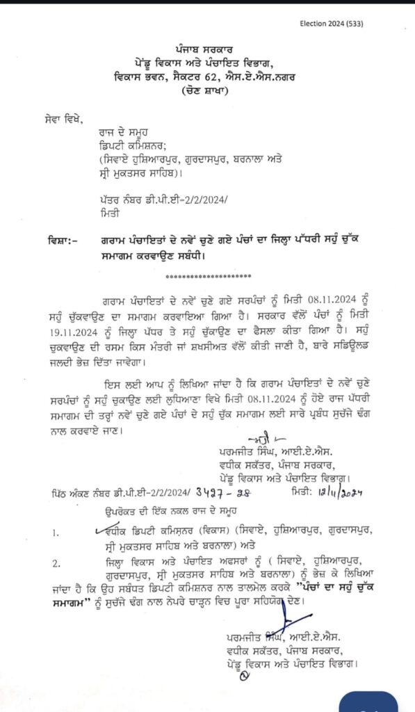 ਪੰਜਾਬ ਵਿੱਚ ਨਵੇਂ ਚੁਣੇ ਗਏ ਪੰਚਾਂ ਨੂੰ ਸਹੁੰ ਚੁਕਵਾਉਣ ਸਬੰਧੀ ਸਮਾਗਮ 19 ਨਵੰਬਰ ਨੂੰ ਹੋਵੇਗਾ। ਇਹ ਸਮਾਗਮ ਜ਼ਿਲ੍ਹਾ ਪੱਧਰ ਉਤੇ ਹੋਣਗੇ। ਜਦੋਂ ਕਿ ਜਿੰਨਾਂ ਜ਼ਿਲ੍ਹਿਆਂ ਵਿੱਚ ਜ਼ਿਮਨੀ ਚੋਣਾਂ ਹੋਣੀਆਂ ਹਨ ਉਨ੍ਹਾਂ ਜ਼ਿਲ੍ਹਿਆਂ ਵਿੱਚ ਪੰਚਾਂ ਦੇ ਸਹੁੰ ਚੁੱਕ ਸਮਾਗਮ ਨਹੀਂ ਹੋਣਗੇ, ਜਿੰਨਾ ਵਿੱਚ ਹੁਸ਼ਿਆਰਪੁਰ, ਗੁਰਦਾਸਪੁਰ, ਬਰਨਾਲ ਅਤੇ ਸ੍ਰੀ ਮੁਕਤਸਰ ਸਾਹਿਬ ਸ਼ਾਮਲ ਹਨ।