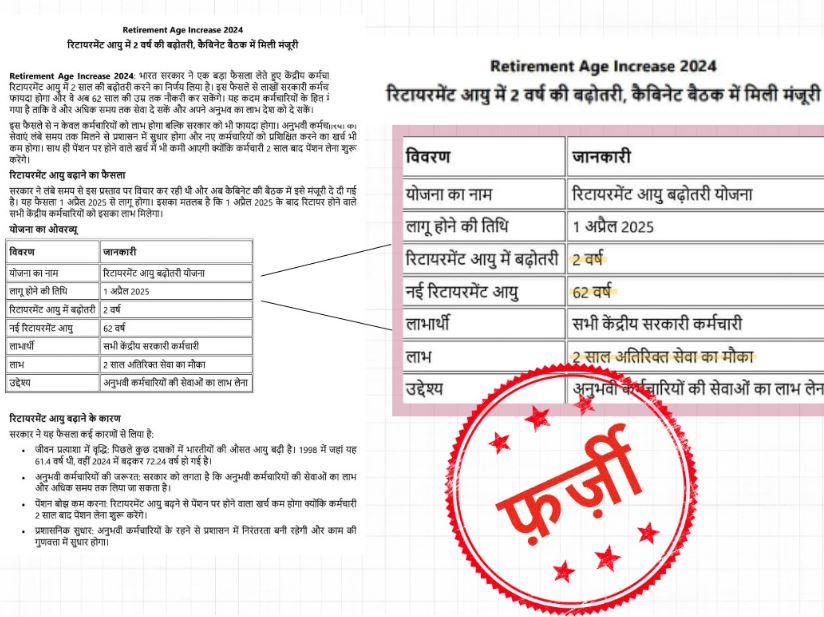ਸੋਸ਼ਲ ਮੀਡੀਆ ਉਤੇ ਕਈ ਤਰ੍ਹਾਂ ਦੇ ਪੱਤਰ ਵਾਇਰਲ ਹੁੰਦੇ ਰਹਿੰਦੇ ਹਨ, ਜੋ ਲੋਕਾਂ ਨੂੰ ਕਾਫੀ ਪ੍ਰਭਾਵਿਤ ਕਰਦੇ ਹਨ। ਇਕ ਅਜਿਹਾ ਹੀ ਪੱਤਰ ਸੋਸ਼ਲ ਮੀਡੀਆ ਉਤੇ ਤੇਜੀ ਨਾਲ ਵਾਇਰਲ ਹੋ ਰਿਹਾ ਹੈ, ਜਿਸ ਵਿੱਚ ਕਿਹਾ ਜਾ ਰਿਹਾ ਹੈ ਕਿ ਕੇਂਦਰ ਸਰਕਾਰ ਨੇ ਕੇਂਦਰੀ ਕਰਮਚਾਰੀਆਂ ਦੀ ਸੇਵਾ ਮੁਕਤੀ ਦੀ ਉਮਰ 62 ਸਾਲ ਕਰ ਦਿੱਤੀ ਹੈ। ਹਾਲਾਂਕਿ , ਇਹ ਦਾਅਵਾ ਪੂਰੀ ਤਰ੍ਹਾਂ ਝੂਠਾ ਹੈ। ਭਾਰਤ ਸਰਕਾਰ ਦੇ ਪ੍ਰੈਸ ਸੂਚਨਾ ਬਿਊਰੋ ਨੇ ਸਪੱਸ਼ਟ ਕੀਤਾ ਹੈ ਕਿ ਸਰਕਾਰ ਨੇ ਕੇਂਦਰੀ ਕਰਮਚਾਰੀਆਂ ਦੀ ਸੇਵਾ ਮੁਕਤੀ ਉਮਰ ਵਧਾਉਣ ਦਾ ਕੋਈ ਫੈਸਲਾ ਨਹੀਂ ਕੀਤਾ।