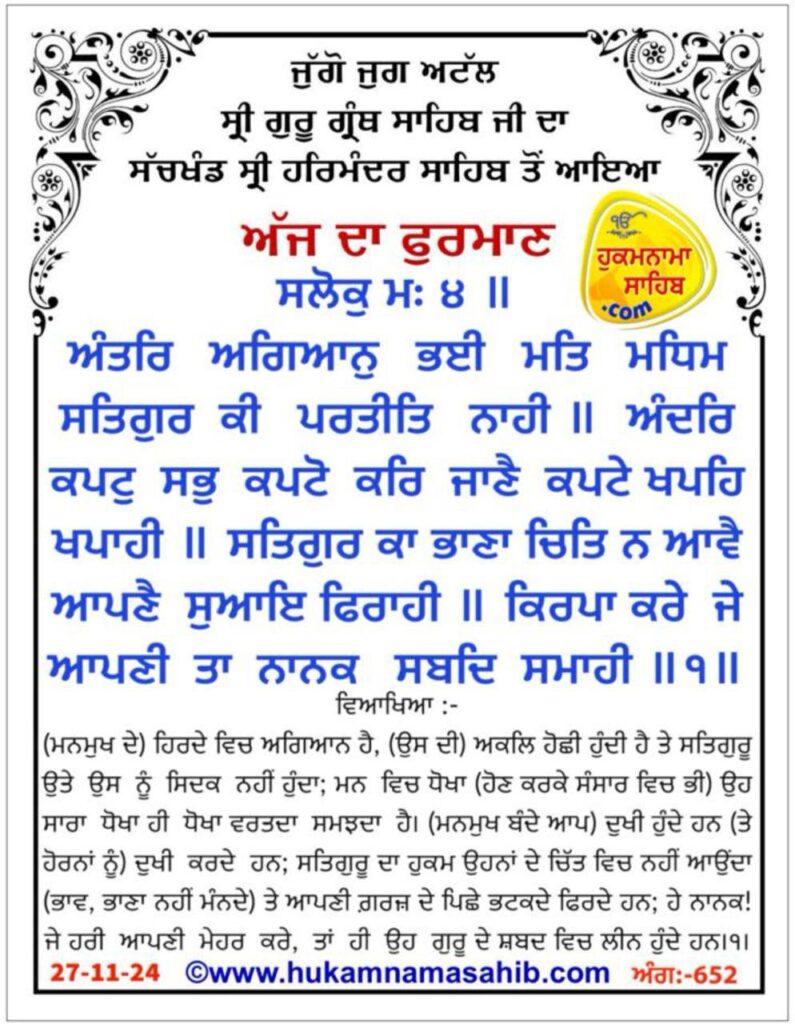 ਅੰਮ੍ਰਿਤ ਵੇਲੇ ਦਾ ਹੁਕਮਨਾਮਾ ਸੱਚਖੰਡ ਸ੍ਰੀ ਹਰਿਮੰਦਰ ਸਾਹਿਬ 27-11-2024