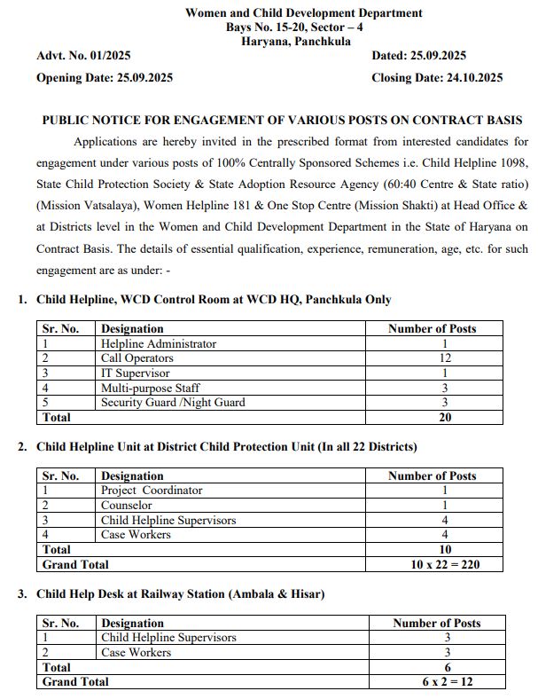 महिला एवं बाल विकास विभाग में बड़ी संख्या में भर्तियाँ निकली हैं। हरियाणा सरकार के महिला एवं बाल विकास विभाग की ओर से इन पदों को भरने के लिए 24 अक्टूबर 2025 तक आवेदन मांगे गए हैं।